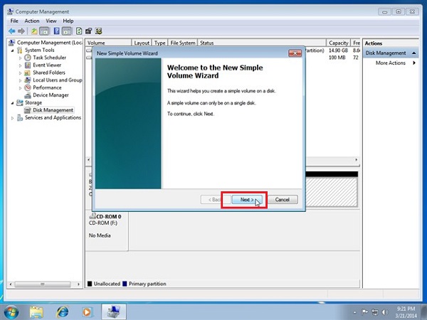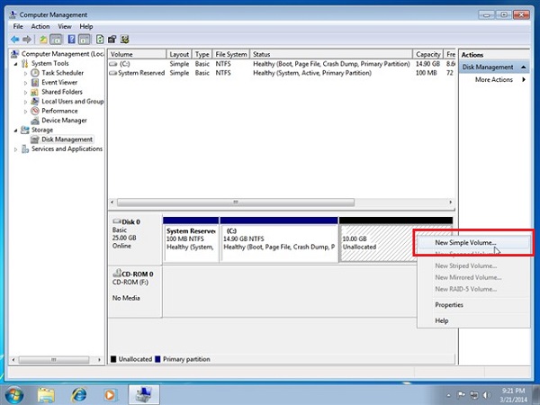 Bước 3 : Đợi một lát và hệ điều hành windows sẽ tạo cho người dùng một phân vùng mới, tuy nhiên phân này là phân vùng chưa xác định và cũng chưa thể sử dụng được vì vậy người dùng sẽ tạo mới bằng cách click chuột phải và chọn vào New Simple Volume…
