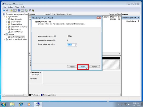 Bước 5 : Tiếp tục nhấn vào Next thì các bạn có thể thay đổi dung lượng phân vùng ở ô Simple Volume nếu như muốn