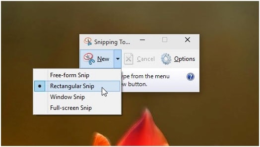 Bước 2: Nhấn vào nút New ở giao diện. Bạn chỉ cần nhấn vào biểu tượng icon tam giác ngược ngay cạnh nút New để có thể mở những tùy chọn chụp ảnh cho màn hình, bao gồm: cắt khung hình một cách tự do (Free-form Snip), Cắt khung có hình chữ nhật(Rectangular Snip), Chụp phần cửa sổ của khung hình (Windows Snip) và chụp toàn bộ màn hình máy tính (Full-screen Snip).