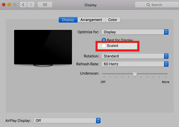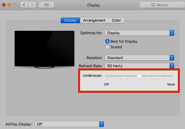 Bước 6 : Nhấp vào kéo con trượt Underscan ở cuối trang về phía bên trái để màn hình máy tính Mac hiển thị nhiều hơn ở trên màn hình thứ hai hoặc kéo về bên phải để phóng to màn hình