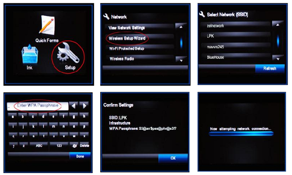 Bước 2 : Kết nối mạng wifi cho máy in. Đối với các dòng máy in có màn hình là LCD hiển thị thì bạn thực hiện lần lượt như ở trong hình bên dưới và kết nối mạng wifi đang được sử dụng cho máy in.