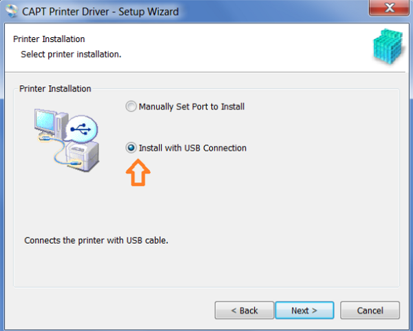 Chạy file -> Next -> Chọn Yes -> chọn Install with USB connect ( là cổng kết nối máy in với laptop bằng cáp USB )