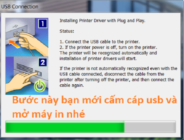 Lưu ý để cho việc cài đặt đúng với trình tự thì bạn không cắm dây cáp kết nối máy in với laptop vào trước. Mà phải chạy file cài đặt trước đến khi nào có thông báo cắm kết nối dây cáp thì mới cắm vào. Như vậy thì việc cài đặt driver máy in sẽ không bị lỗi.