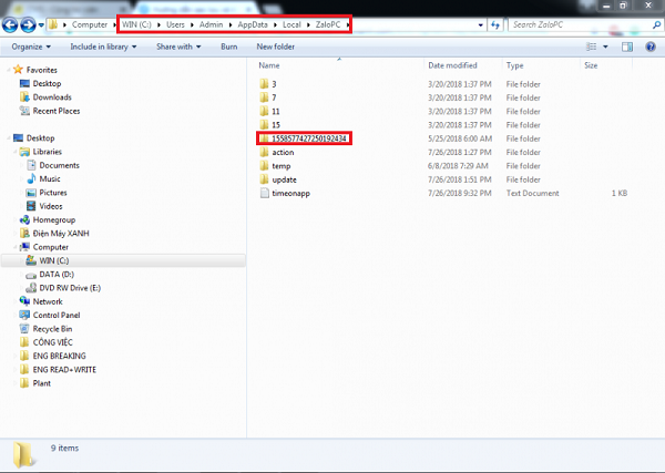 Bước 2 : Ở trên máy tính thì các bạn truy cập vào đường dẫn của thư mục C:UsersAdministratorAppDataLocalZaloPC