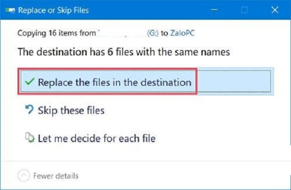 Bước 3 : Hệ thống sẽ hỏi các bạn có ghi đè lên Foler hay không, hãy lựa chọn vào mục Replace files in the destination để có thể tiến hành ghi đè file, Foler.