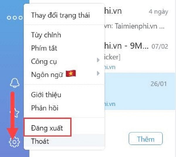 Bước 1 : Để khôi phục tin nhắn của zalo ở trên máy tính đầu tiên các bạn cần phải đăng xuất và thoát zalo PC hoàn toàn trước đã, rồi sau đó thì click vào biểu tượng Setting-> tiếp đến là lựa chọn Đăng xuất hoặc là Thoát