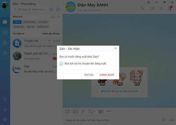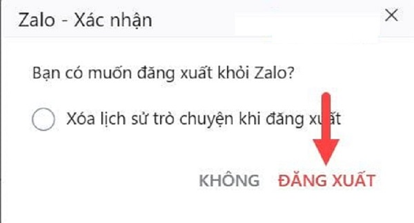 Bước 1 : Trước hết nếu muốn thoát tài khoản Zalo ở trên máy tính, khi nhấn vào Đăng xuất các bạn sẽ được hỏi lại rằng có muốn xóa toàn lịch sử cuộc trò chuyện hay không. Bạn không nhấn vào Xóa lịch sử rồi nhấn vào Đăng xuất hoặc nếu không muốn thoát thì cứ để tài khoản như vậy.