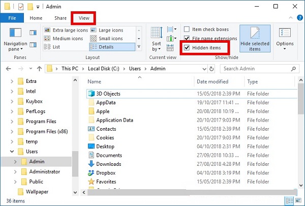 Bước 3 : Nếu trong trường hợp bạn không nhìn thấy được thư mục AppData thì nhấn chọn vào nút View rồi sau đó thì tích chọn vào Hidden items. Với hệ điều hành windows 7 trở xuống nhấn vào nút Tools tiếp đến chọn vào Folder…rồi tiếp theo cũng tích chọn vào mục Show hidden files, folder, and, drivers.