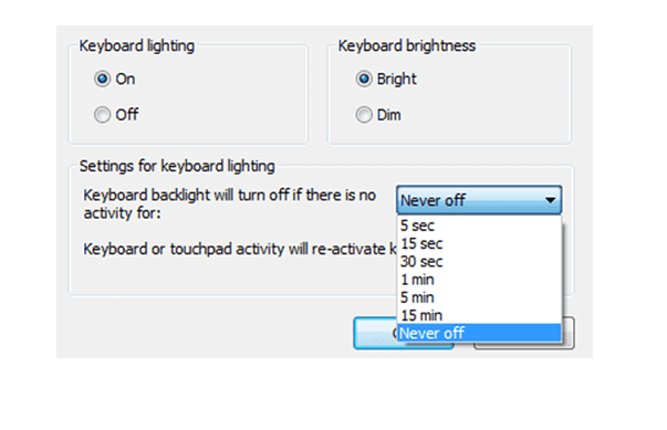 Bước 4: Lúc này ở trên màn hình máy tính đã xuất hiện cửa sổ popup của Keyboard Backlight. Thì ở tại mục Keyboard lighting này các bạn thiết lập là ON. Nếu như muốn điều chỉnh về độ sáng của bàn phím thì các bạn có thể lựa chọn là Bright hoặc Dim.