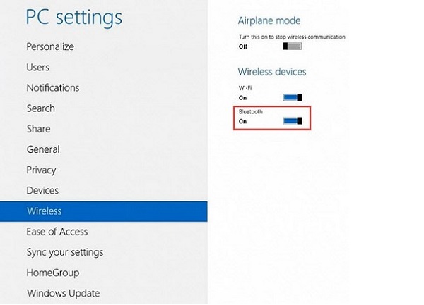 Bước 2 : Tiếp theo bạn chọn mục setting -> sau đó tiếp tục chọn vào mục change PC setting -> click chọn vào phần Wireless -> cuối cùng thì bạn kích on là mục bluetooth để mở như hình ở phía dưới