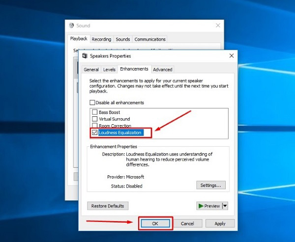 Bước 3 : Tại giao diện Speakers Properties, chọn vào thẻ Enhancements. Sau đó, tích chọn vào dòng Loudness Equalization. Cuối cùng, nhấn vào OK để lưu lại thay đổi.