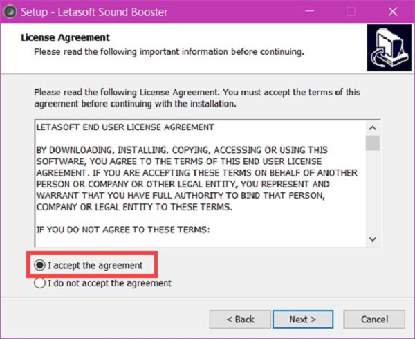 Bước 3 : Tiếp tục nhấn I accept the agreement và đồng ý với những điều khoản để có thể cài đặt được Sound Booster.