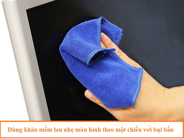 Dùng khăn bông mềm lau nhẹ màn hình theo một chiều đúng nhất định. Không nên lau theo vòng tròn hay là chà xát quá nặng vì khó có thể loại bỏ bụi bẩn một cách triệt để và còn làm gây hư hại màn hình. Lau khắp ở màn hình cho đến khi hết bụi.