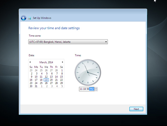 Cuối cùng cài đặt giờ và chọn mạng cho Win 7 thế là xong.