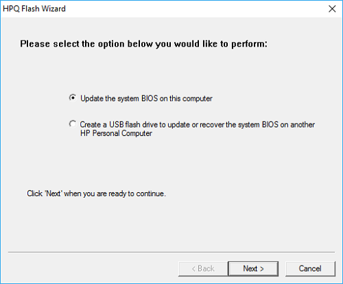 Khi các bạn chạy file EXE BIOS được tải về từ trang chủ của HP thì sẽ có hai lựa chọn:
