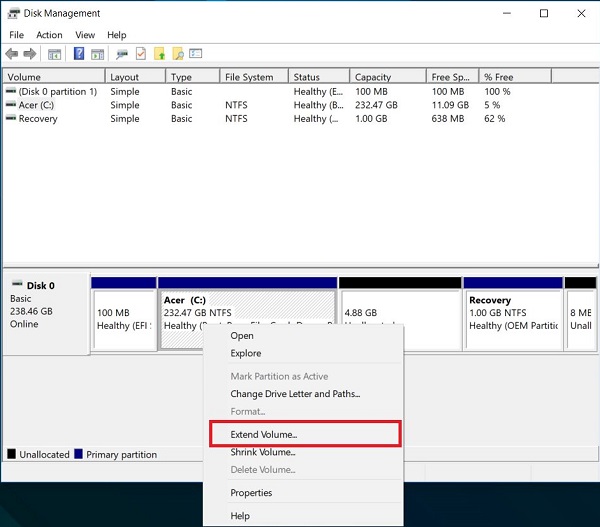 Bước 3 : Sau khi xóa phân vùng thì ngay lúc này người dùng có thể gộp phân vùng bên cạnh bằng cách bấm chuột phải vào phân vùng E -> tiếp đến chọn Extend Volume -> tiếp theo chọn vào Finish.