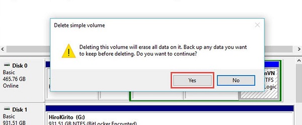Bước 2 : Hộp thoại mới hiện ra trên màn hình sẽ Xác nhận việc các bạn có thể muốn xóa phân vùng hay là không bởi hành động nay sẽ xóa toàn bộ dữ liệu ở trên nó. Chọn vào Yes để tiếp tục
