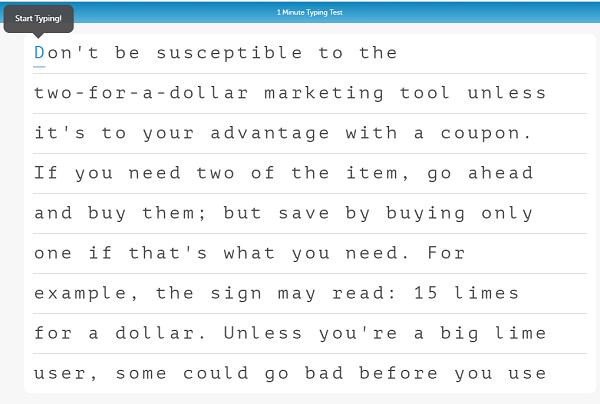 Phần mềm kiểm tra tốc độ đánh máy trung bình này sẽ bắt đầu tính khi các bạn nhập chữ đầu tiên và còn có thể nhìn được khoảng thời gian còn lại. Các bạn có thể cải thiện khả năng gõ phím của bản thân mình với bài kiểm tra chỉ trong vòng 1 phút và tối đa khoảng 200 chữ.