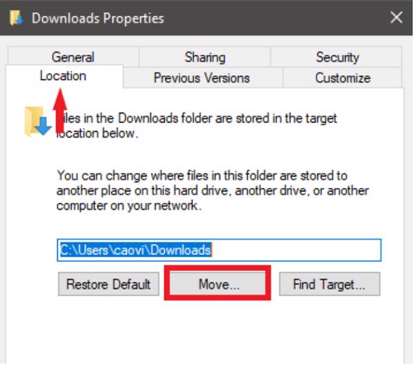 Sau đó các bạn chuyển qua tab Location và tiếp đến chọn vào Move… Tại cửa sổ mới hiện ra trên màn hình các bạn chọn nhà mới cho ổ đĩa Downloads. Lưu ý là chọn ổ đĩa khác với ổ đĩa chứa hệ điều hành nhé và cuối cùng nhấp OK để lưu lại thôi.