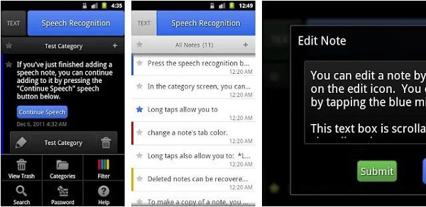 Thay vì gõ phím, bạn có thể tận dụng phần mềm chuyển lời nói trở thành văn bản. So với những ứng dụng khác, ListNote Speech-to-Text Notes tương đối dễ sử dụng và mọi dữ liệu đều đã được lập chỉ mục nên việc tìm kiếm diễn ra khá nhanh… Nếu muốn bảo vệ tập tin của bạn khỏi con mắt tò mò của người khác và bạn có thể đặt mật khẩu hoặc là mã hóa nội dung theo tiêu chuẩn AES.