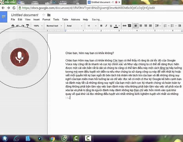 Bây giờ thì các bạn chỉ cần nói những chữ cần nhập vào văn bản. Ngoài Tiếng Việt ra, ứng dụng Google Docs còn hỗ trợ hơn 40 thứ tiếng khác nhau và các bạn có thể lựa chọn ngay tại phần ở trên của biểu tượng Microphone.