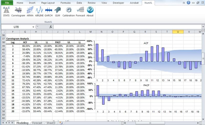 - Phân tích chuỗi thời gian: NumXL cung cấp nhiều chức năng để phân tích dữ liệu chuỗi thời gian, bao gồm tự tương quan, trung bình động, làm mịn hàm mũ, v.v. Các chức năng này giúp bạn hiểu các mẫu và xu hướng trong dữ liệu của mình.