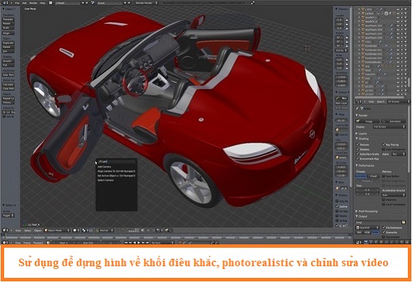 Blender là một trong những ứng dụng tạo mô hình 3D hoàn toàn miễn phí. Những tính năng này thường được dân thiết kế đồ họa 3D dùng để sử dụng nhiều bao gồm như là dựng hình về khối điêu khắc cũng như là dựng hình photorealistic hoặc dựng nhân vật hoạt hình và chỉnh sửa video.