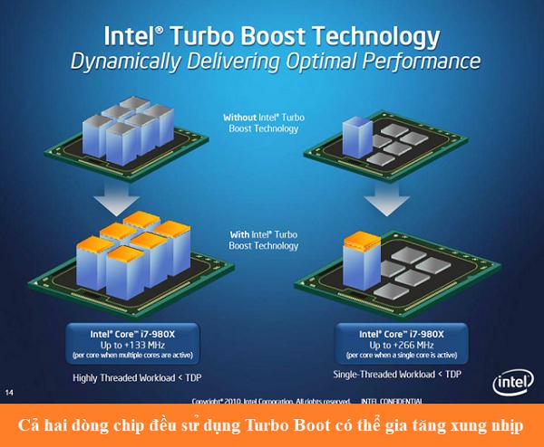 Dòng core i5 và i7 sử dụng Turbo Boot có thể gia tăng xung nhịp khi cần. Điều này có nghĩa rằng các dòng vi xử lý này sẽ tiêu thụ ít điện năng hơn khi hoạt động bình thường và sẽ gia tăng tốc độ khi chạy những ứng dụng nặng ký. Do đó, các con số xung nhịp được mô tả cùng với sản phẩm không phải là mức xung nhịp cố định của chip i5 và i7