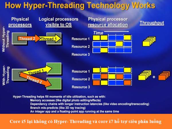 Chính vì sự bất tiện này mà công nghệ Hyper- Threading ra đời với việc cho phép mở rộng khả năng xử lý đa luồng, nhiều tiến trình cùng một lúc ở trên 1 nhân vật thông qua sự phân chia tài nguyên sử dụng. Nhưng core i5 lại không có Hyper- Threading và core i7 có hỗ trợ siêu phân luồng. Nếu các bạn cần một dòng chip 4 nhân mạnh mẽ hết mức có thể thì bạn cần phải chọn Core i7.