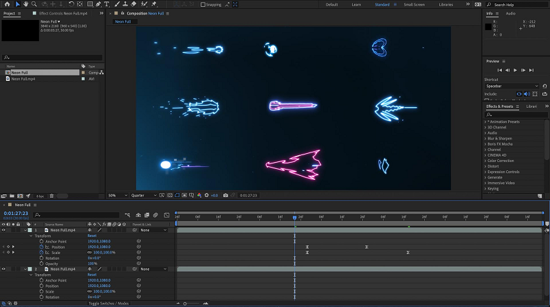 After Effects là một ứng dụng phần mềm đa năng cho phép bạn tạo đồ họa chuyển động, hiệu ứng hình ảnh và hoạt ảnh tuyệt đẹp. Nó có sẵn cho cả máy tính Mac OS và Windows, giúp nhiều người dùng có thể truy cập được. Mặc dù After Effects không phải là phần mềm chỉnh sửa video, nhưng nó thường được sử dụng cùng với các công cụ chỉnh sửa video để nâng cao và thêm hiệu ứng cho cảnh quay.