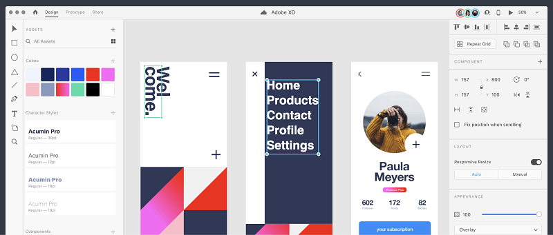 Các nhà thiết kế có thể tạo các bảng vẽ với các kích thước màn hình khác nhau và XD sẽ tự động điều chỉnh và thay đổi kích thước các đối tượng để phù hợp với các màn hình đó. Điều này đảm bảo rằng thiết kế thích ứng liền mạch với các thiết bị khác nhau, chẳng hạn như điện thoại di động và PC.