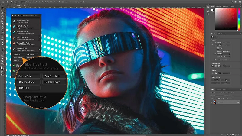 Nik Color Efex là một plugin cung cấp một loạt các bộ lọc để tăng cường màu sắc, tông màu, độ tương phản, v.v. Với hơn 50 bộ lọc để lựa chọn, bạn có thể dễ dàng thêm các hiệu ứng sáng tạo vào ảnh của mình và tạo cho chúng một diện mạo độc đáo. Cho dù bạn muốn thêm độ ấm cho phong cảnh, tạo hiệu ứng phim cổ điển hay áp dụng các điều chỉnh có chọn lọc, Nik Color Efex có các công cụ để biến điều đó thành hiện thực.