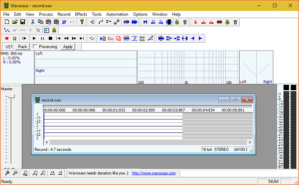 Không chỉ là một phần mềm về chỉnh sửa âm thanh đơn thuần mà Wavosaur còn tích hợp các công cụ khác như là ghi âm để người dùng có thể trực tiếp ghi âm ở trên máy tính qua đó xuất ra một tệp tin về ghi âm riêng hoặc là chèn thẳng vào chỉnh sửa, qua đó không chỉ có ghi âm mà các bạn còn có thể tạo ra những âm thanh đặc biệt từ bản ghi âm gốc đó, khả năng ghi âm của Wavosaur không quá là xuất sắc nhưng với bộ công cụ lọc được tiếng ồn, tạp âm và tinh chỉnh âm thanh thì chắc chắn chất lượng file ghi âm của các bạn sẽ được nâng lên đáng kể.